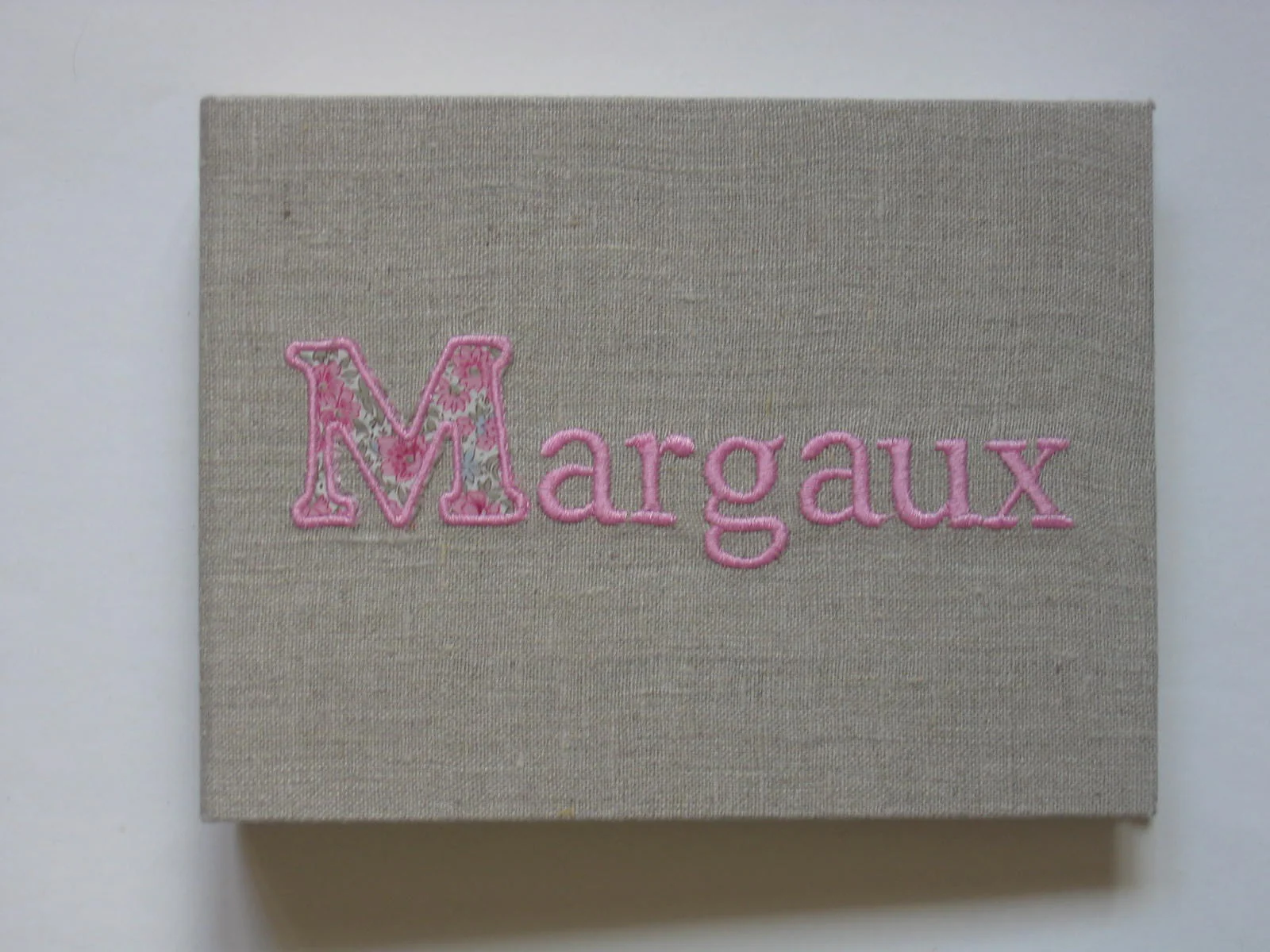 Une grande majuscule en Liberty pour affirmer le prénom. Le Liberty est choisi par la créatrice pour se marier le plus joliment en fonction du tissu de l’album et de la couleur de la broderie.