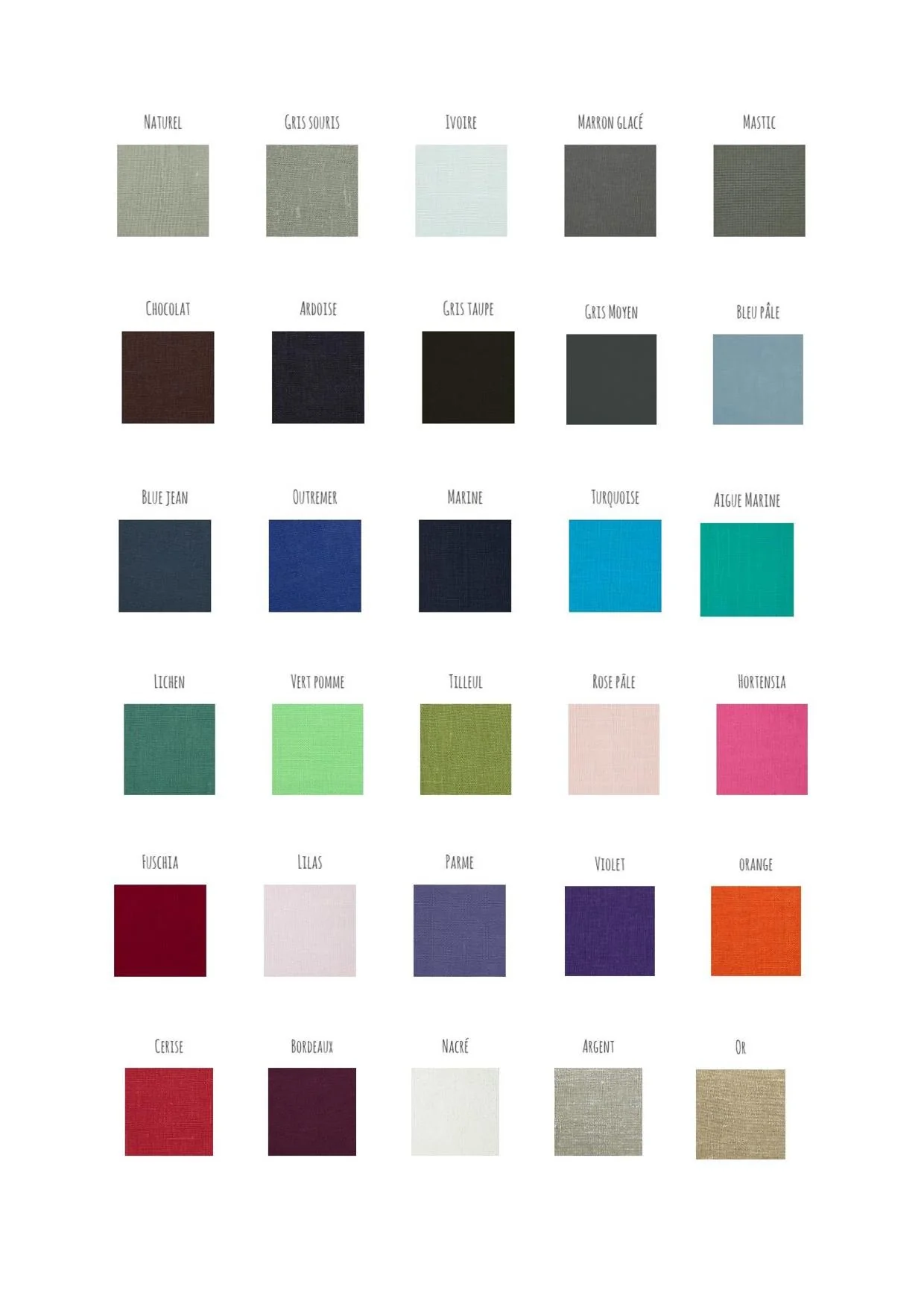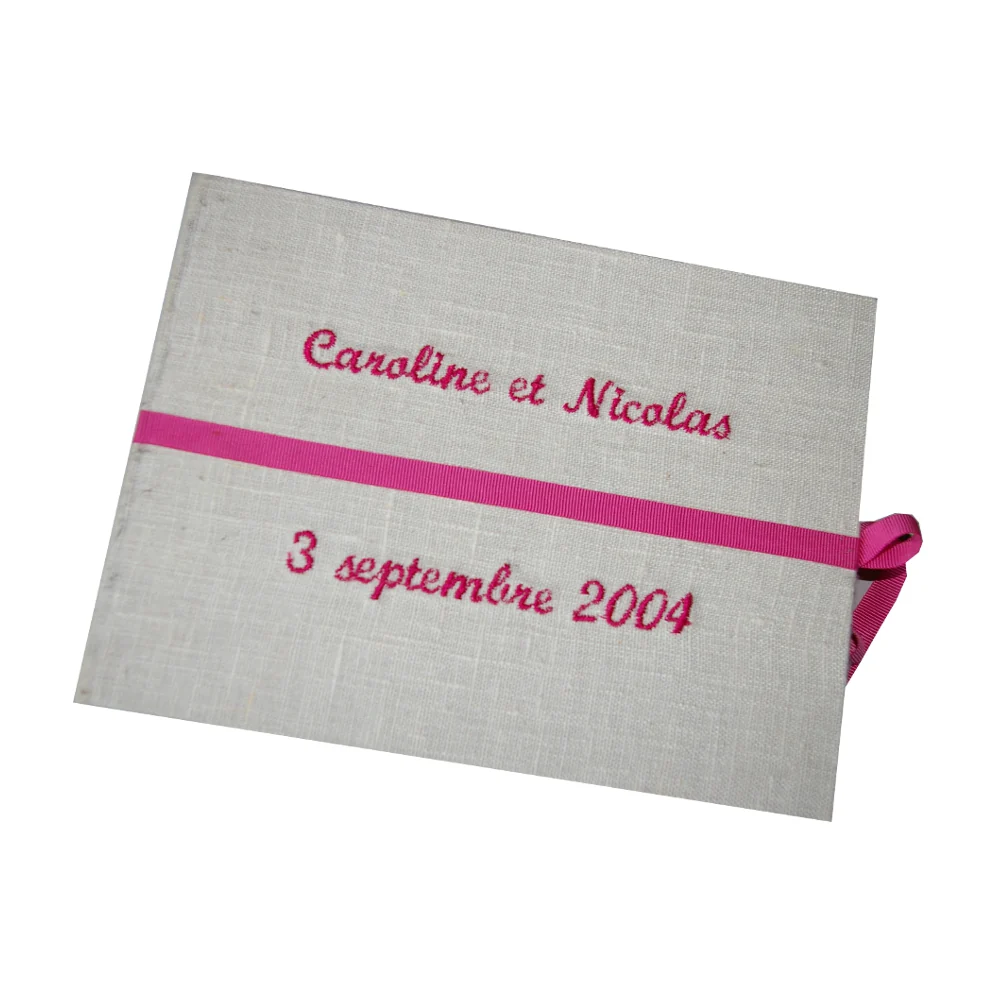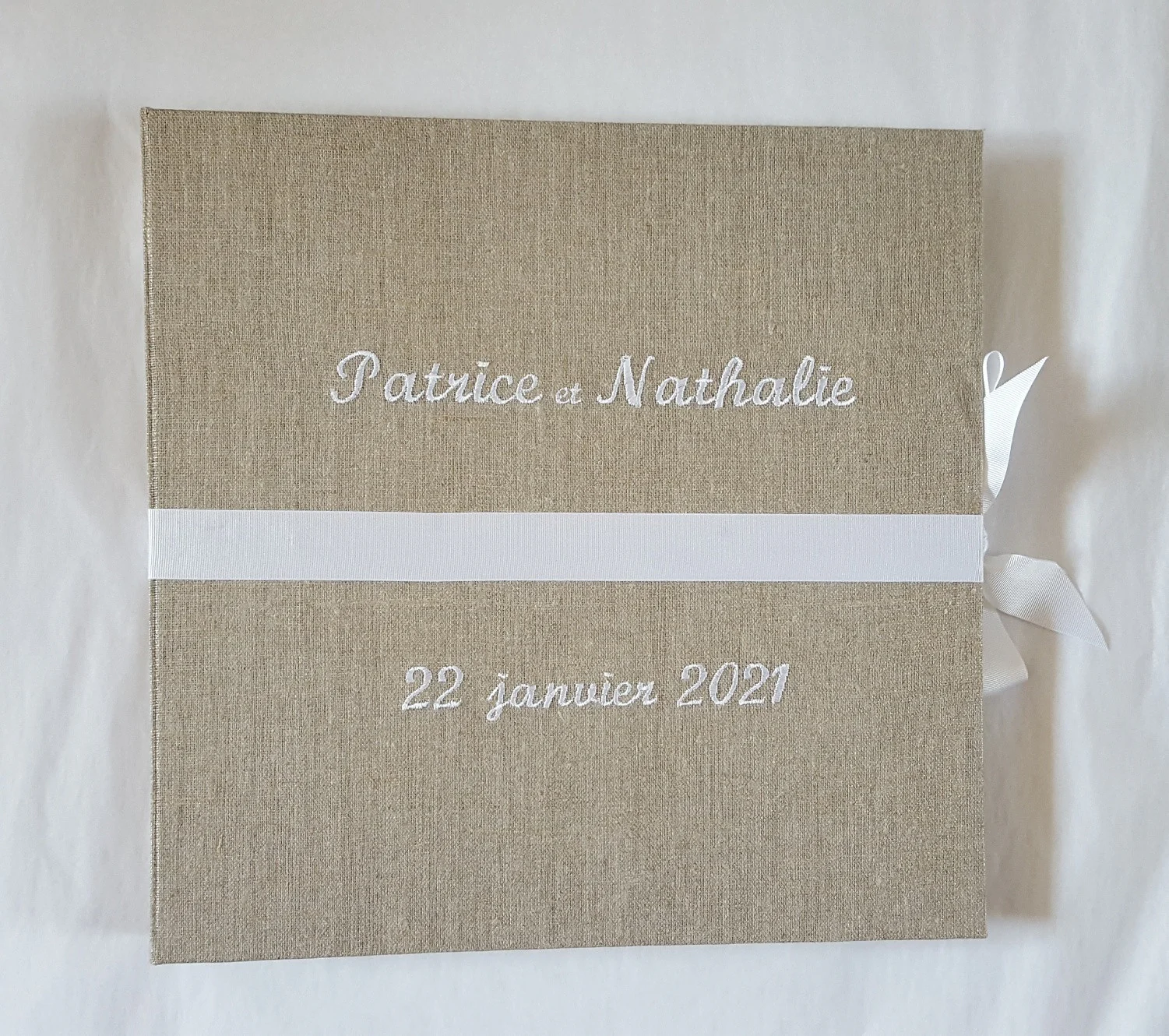 Couverture en lin à choisir parmi le nuancier, fermée par un ruban en gros grain de la couleur de votre choix. Broderie du texte coordonnée.