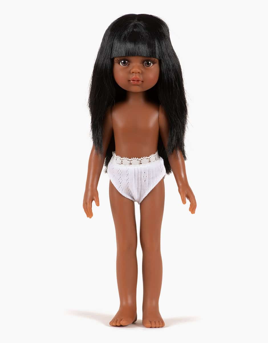 Poupée africaine Nora Corps de 32 cm en vinyle, sans phtalate, cheveux avec frange implantés à la main, yeux fixes avec cils et sourcils peints.Nora, poupée Amigas, vendue avec une culotte en dentelle.(La photo de la poupée présentée n’est pas contractuelle).