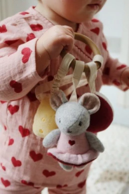Anneau d’activités avec des oursons doux et câlins attachés. Conçu pour stimuler les sens de bébé. Fabriqué à partir d’un mélange de coton biologique et de laine et attaché à un anneau en silicone. 0 m+.