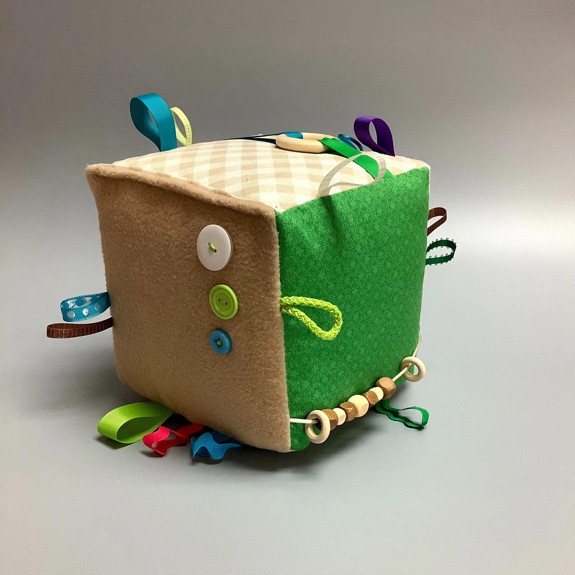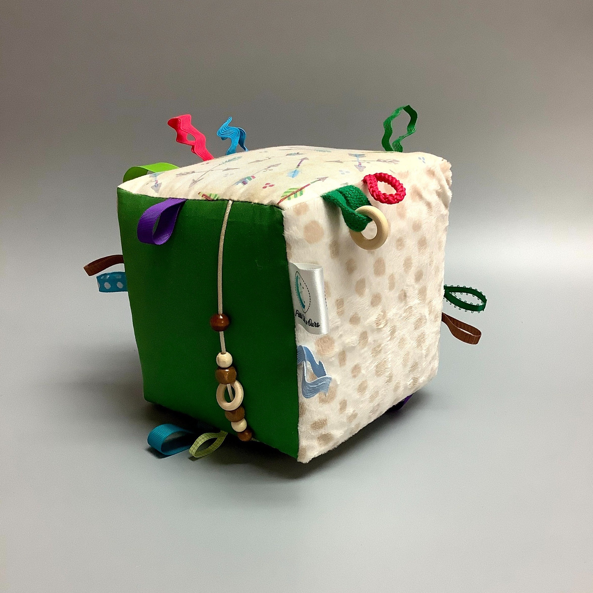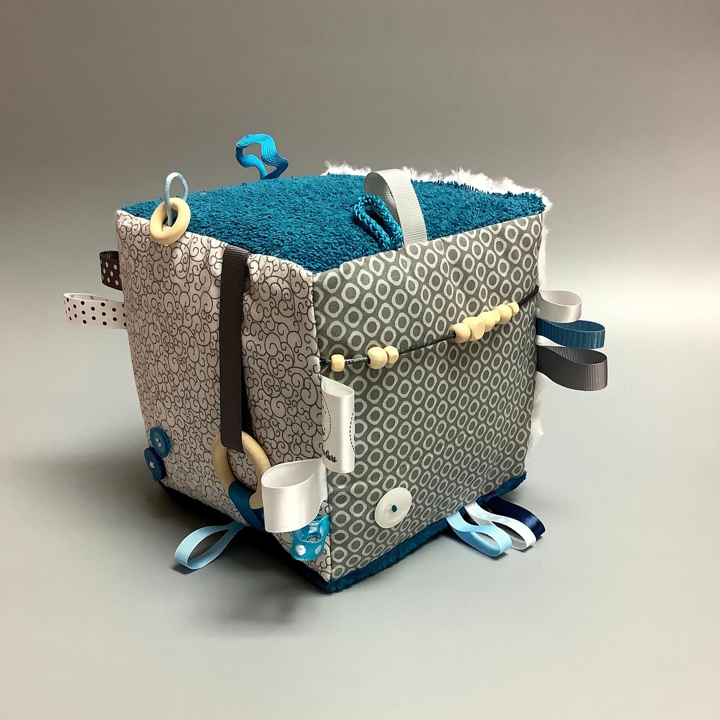 Fait en coton, flanelle, ratine, polar, minky ou rosette (les tissus peuvent varier d’un ballon à l’autre). Différentes sortes de rubans et un jouet de dentition en silicone viennent complèter le ballon.