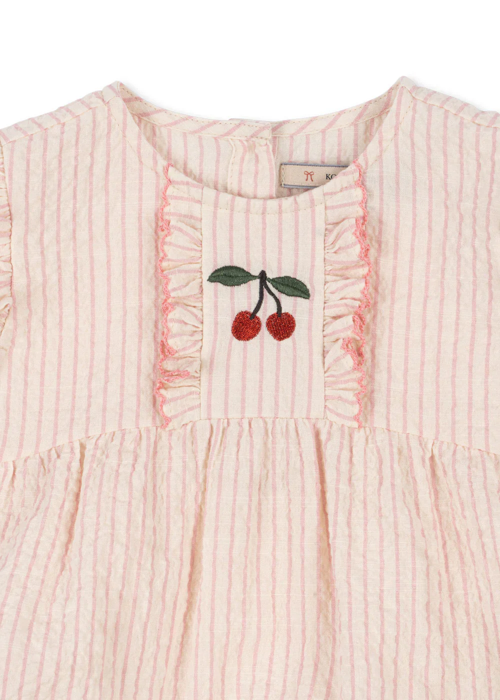 Barboteuse en seersucker doux avec détails à volants. Conçue avec des boutons-pression à l’ouverture de jambe pour un habillage facilité.