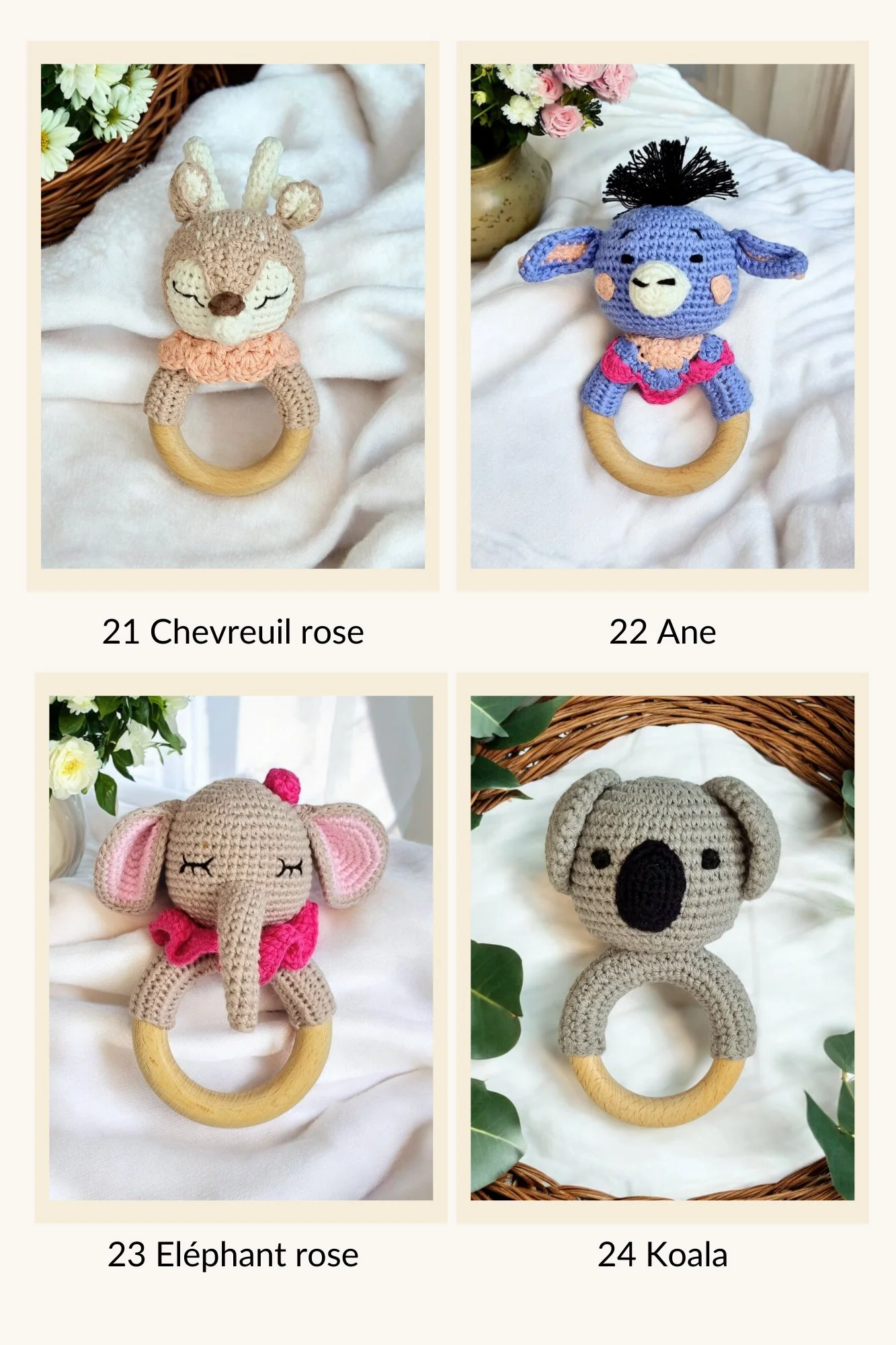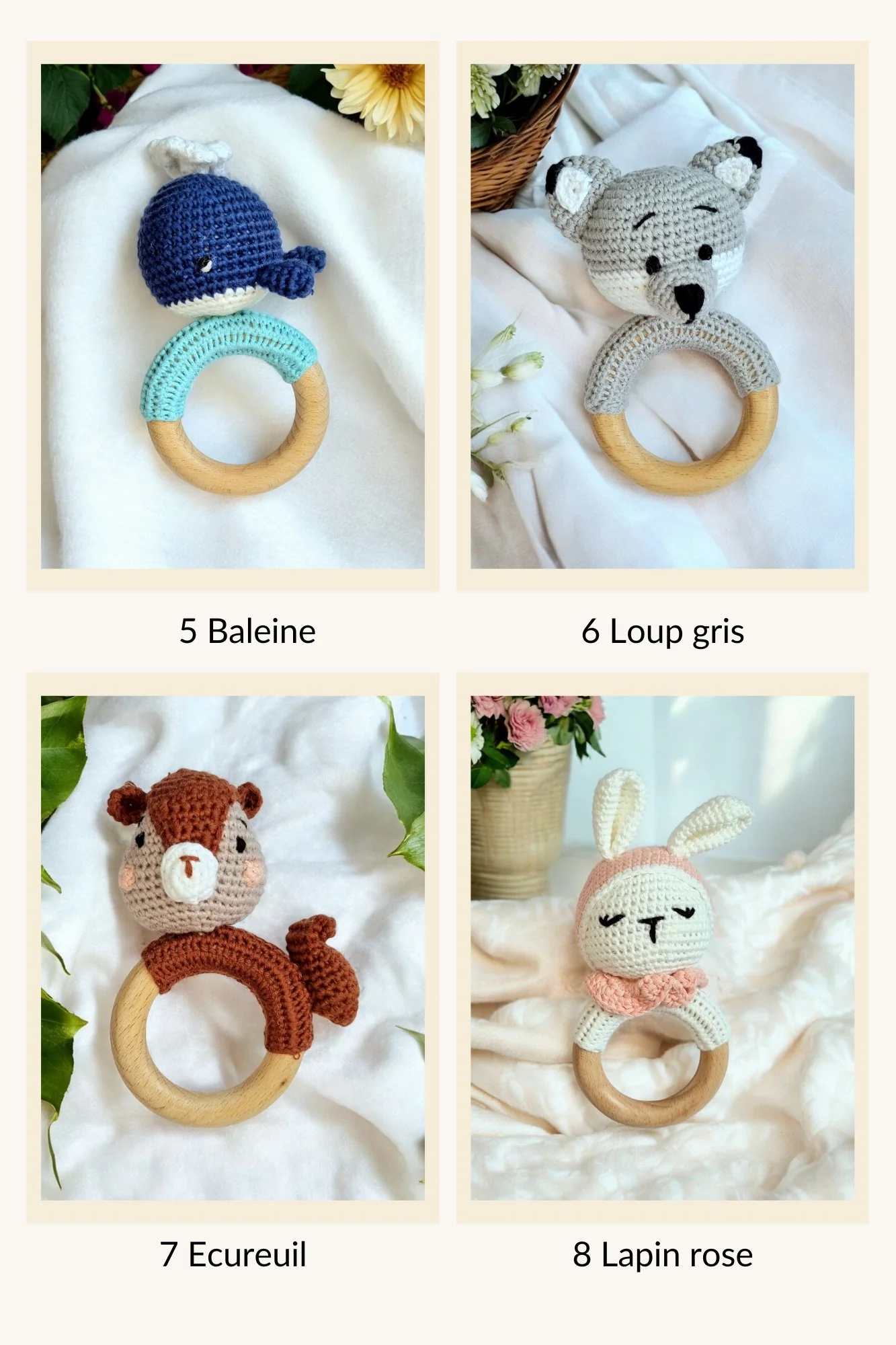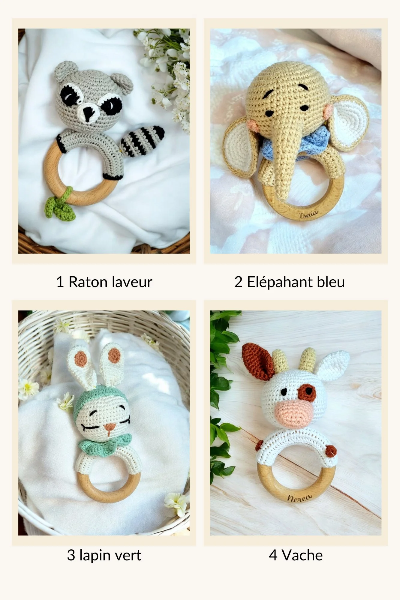- Anneau de Dentition Personnalisé : Un anneau en bois avec un personnage en crochet, personnalisable avec le prénom du bébé gravé sur le bois.