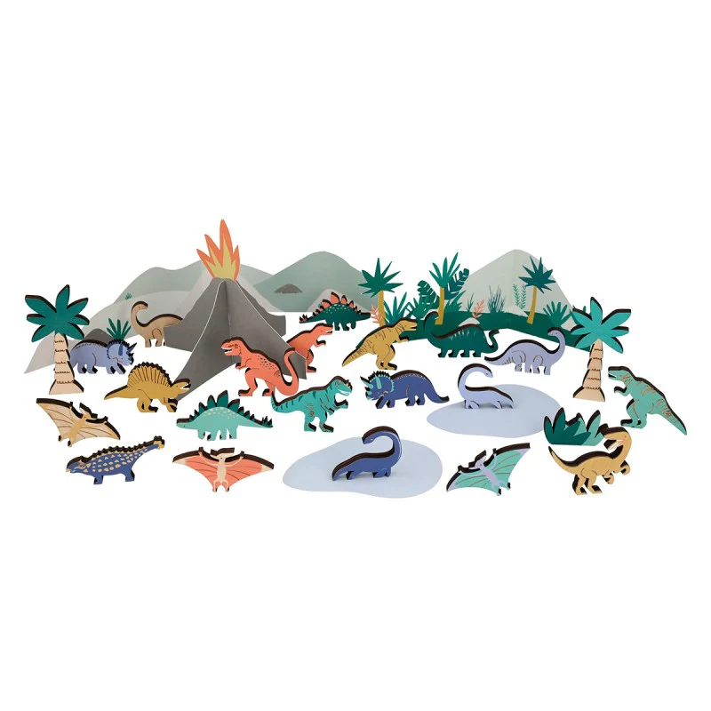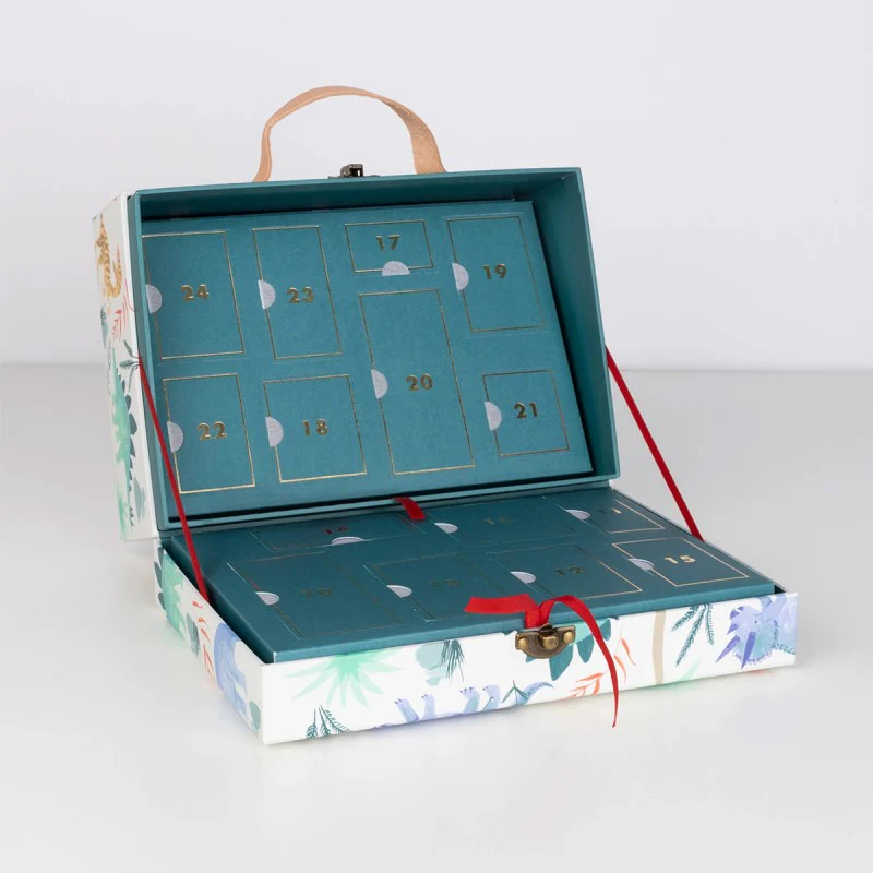 Ce calendrier de l’avent contient 20 dinosaures en bois aux couleurs vives et 3 pièces de foliage en bois, et une scène en carton. Lorsque le temps de jeu est terminé, toutes les pièces peuvent être stockées en toute sécurité dans la valise imprimée avec un jolie design de dinosaure.