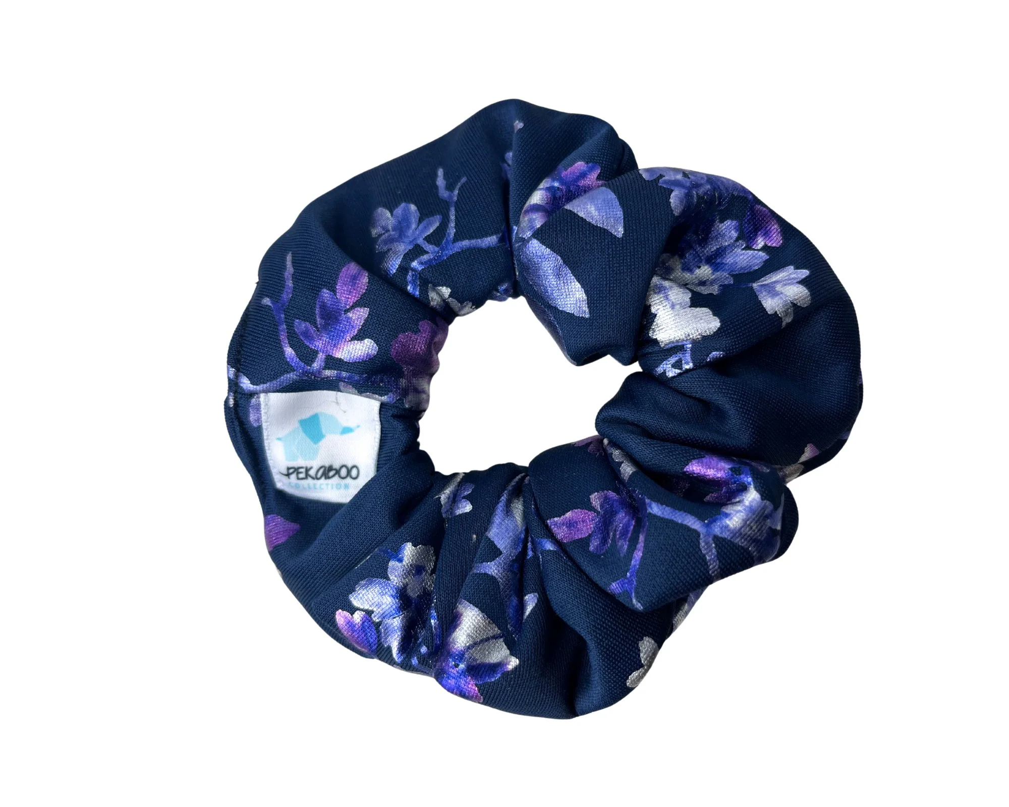 Chouchou élastique pour cheveux – Fleuri bleu métallique