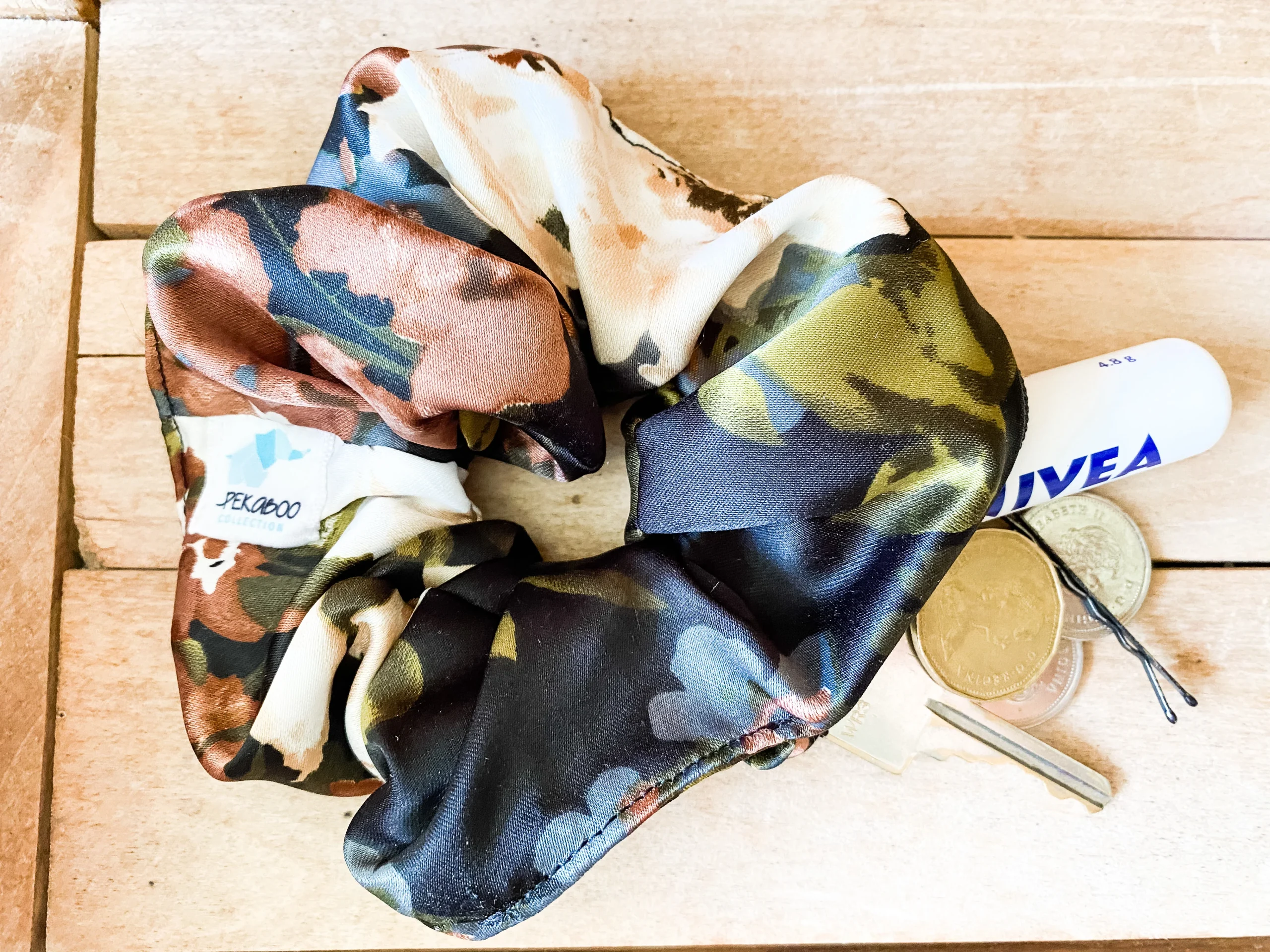 Les chouchous à pochette on été conçus pour vous épargner de toujours traîner votre porte monnaie ou votre sac à main lors de vos sorties. Satin Pratique pour y mettre: -Vos clés -Votre baume à lèvre -Votre argent -Autres Dimensions : 14 cm de diamètre Laver à la main Fait au Québec/ Pekaboo Collection
