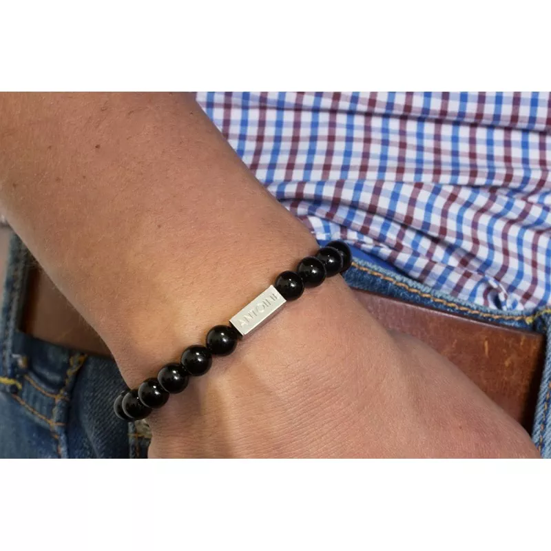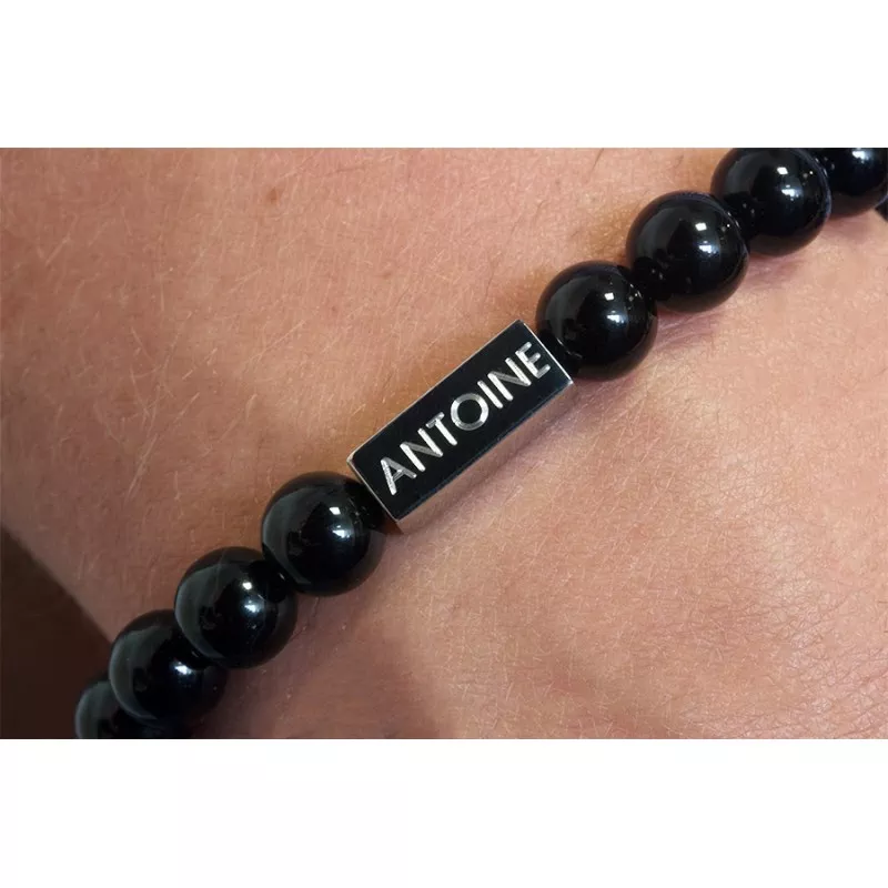 Découvrez notre bracelet perles homme en Agates noires à personnaliser par un prénom ou un mot. La gravure sur une face de la plaque en acier inoxydable vous offrira la possibilité d’offrir un cadeau tendance à message discret. Le montage élastique lui permet de s’adapter à toutes les tailles de poignet.
