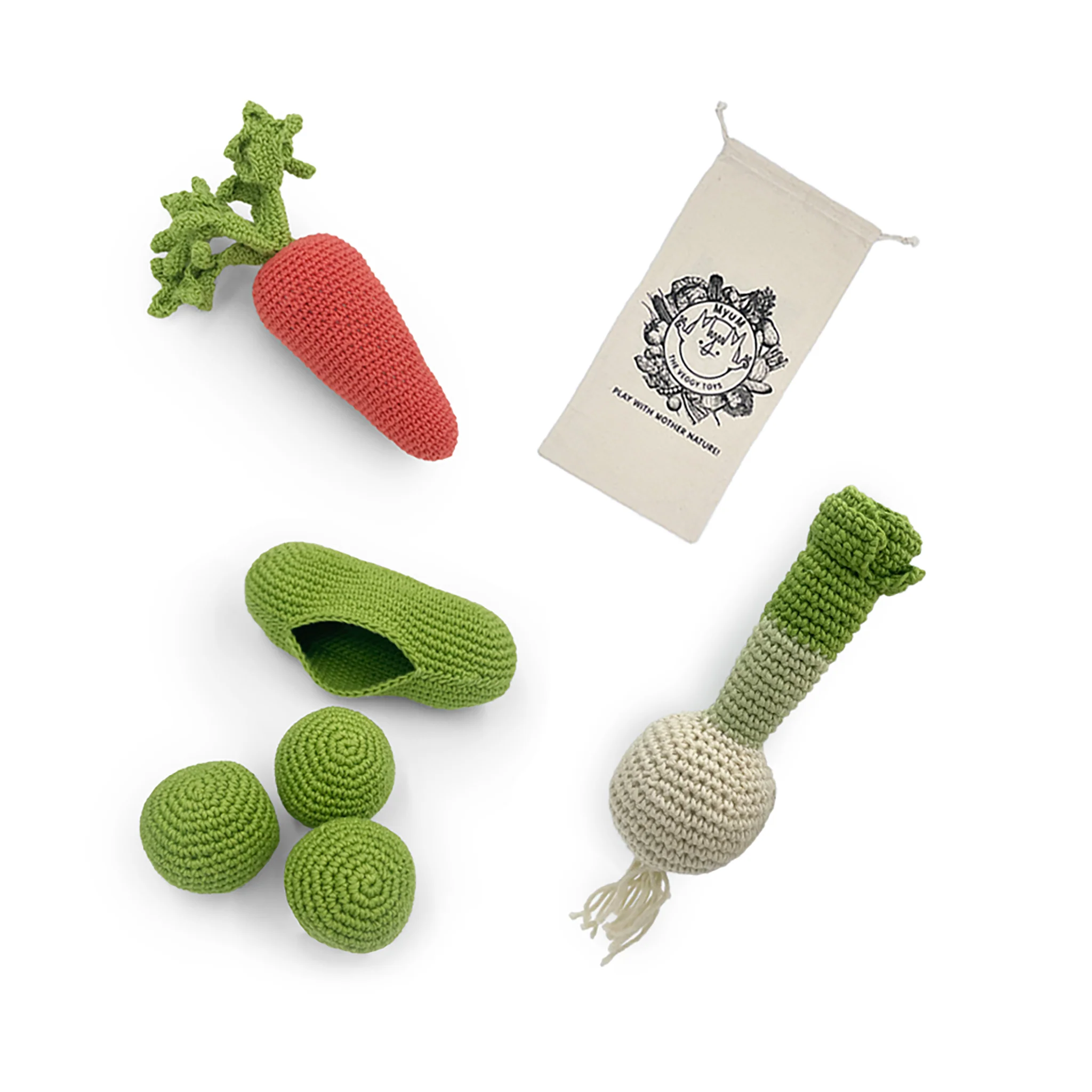 Un coffret de cadeau de naissance green & engagé composé de hochets petit-pois, carotte et oignon nouveau (sans les yeux); le tout dans un sachet en coton bio.