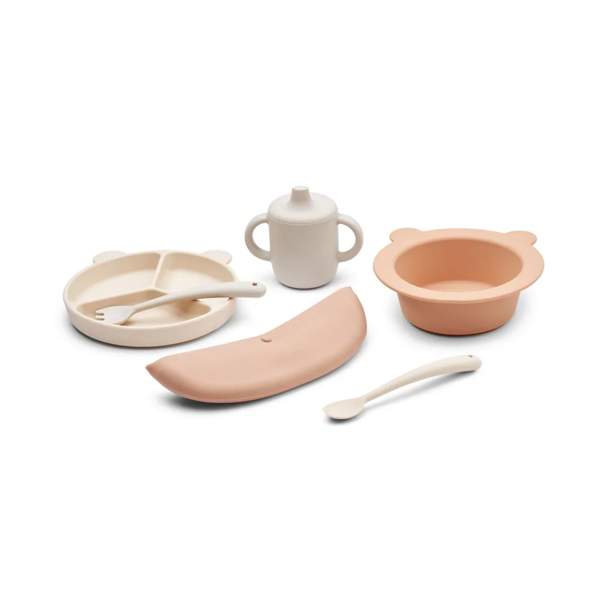 - Le coffret comprend : tasse Neil, bol d’aspiration Peony, cuillère Siv, fourchette Scott, assiette à séparation à ventouses Stacy et bavoir Ember.