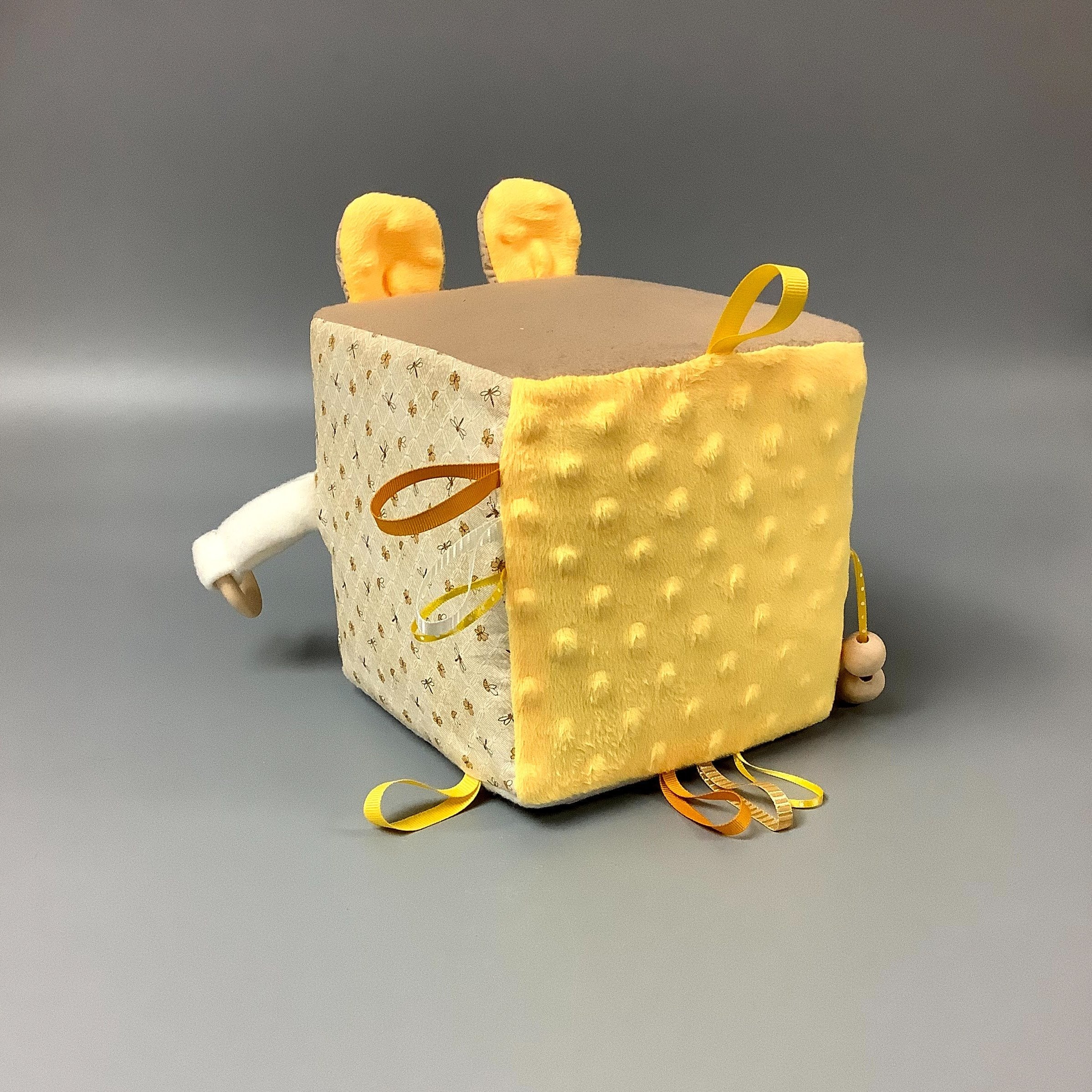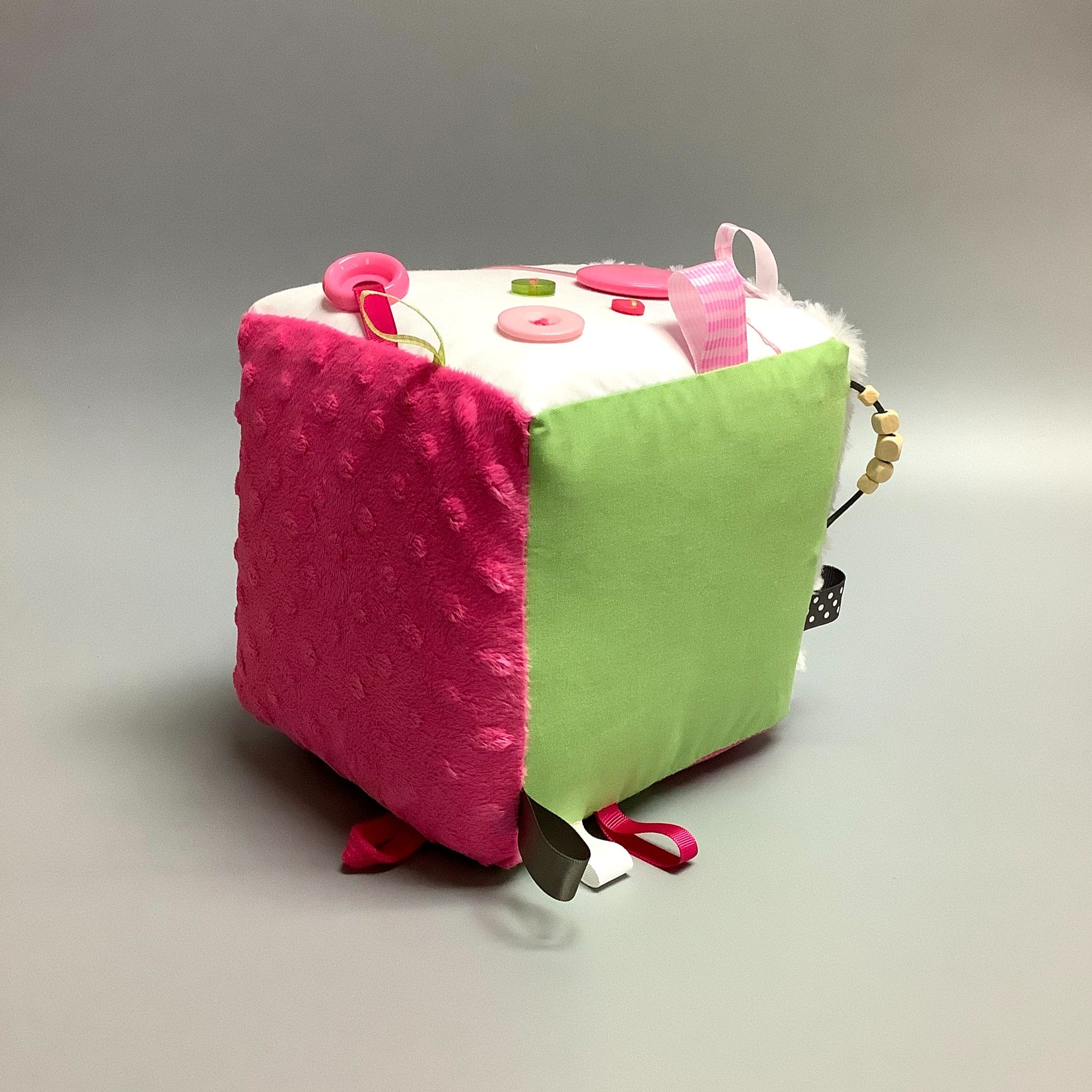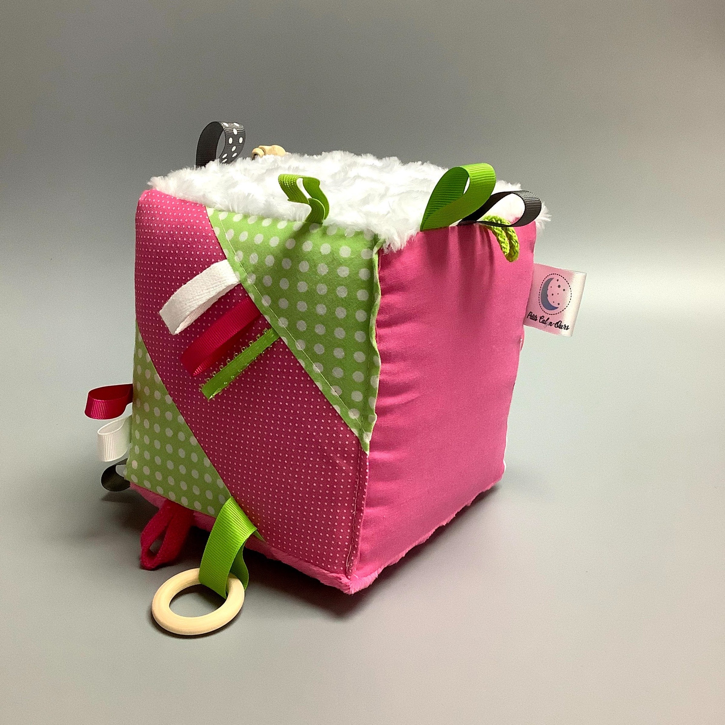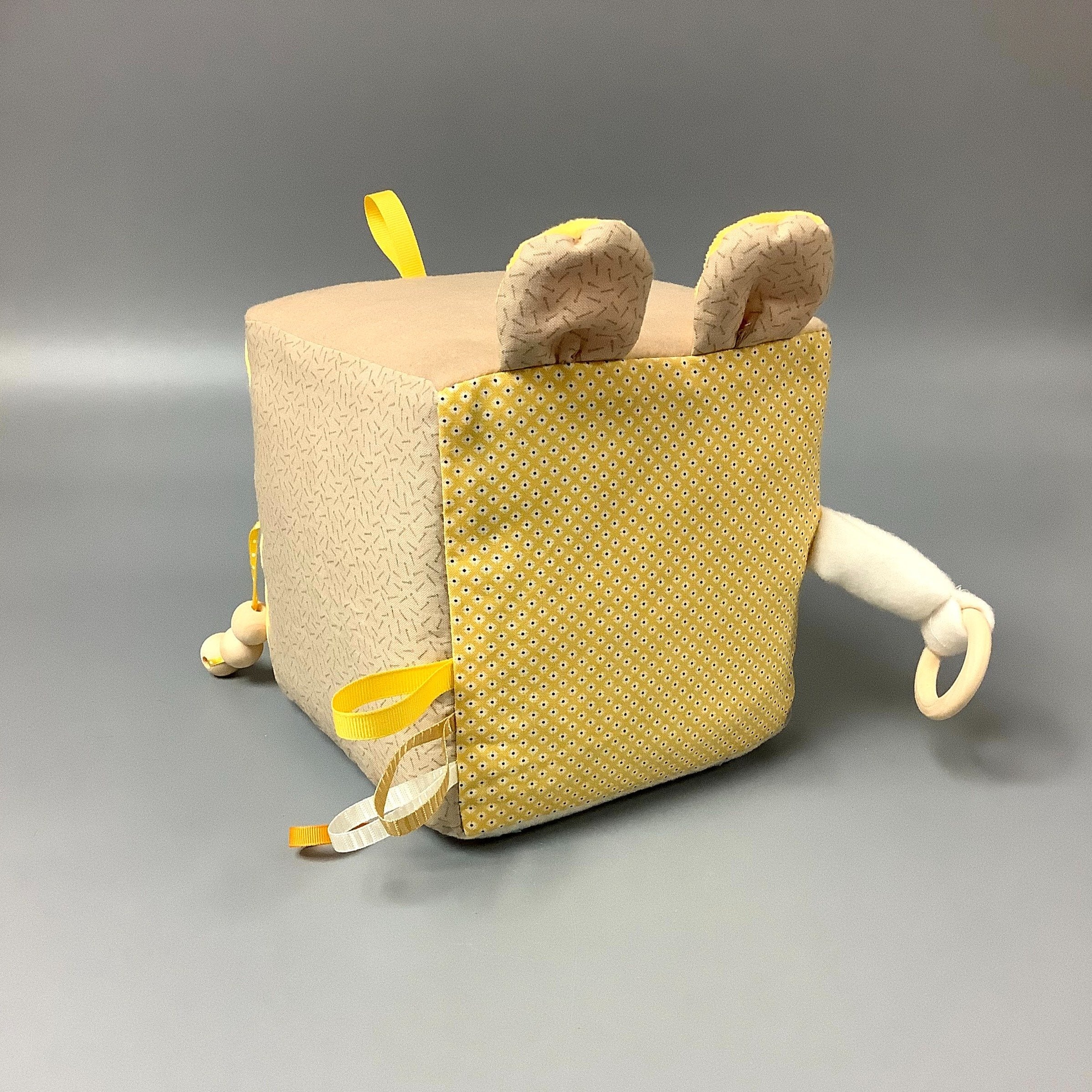 Fait en coton avec rubans et petits accessoires de bois. Le cube fait du bruit lorsqu’il est agité.