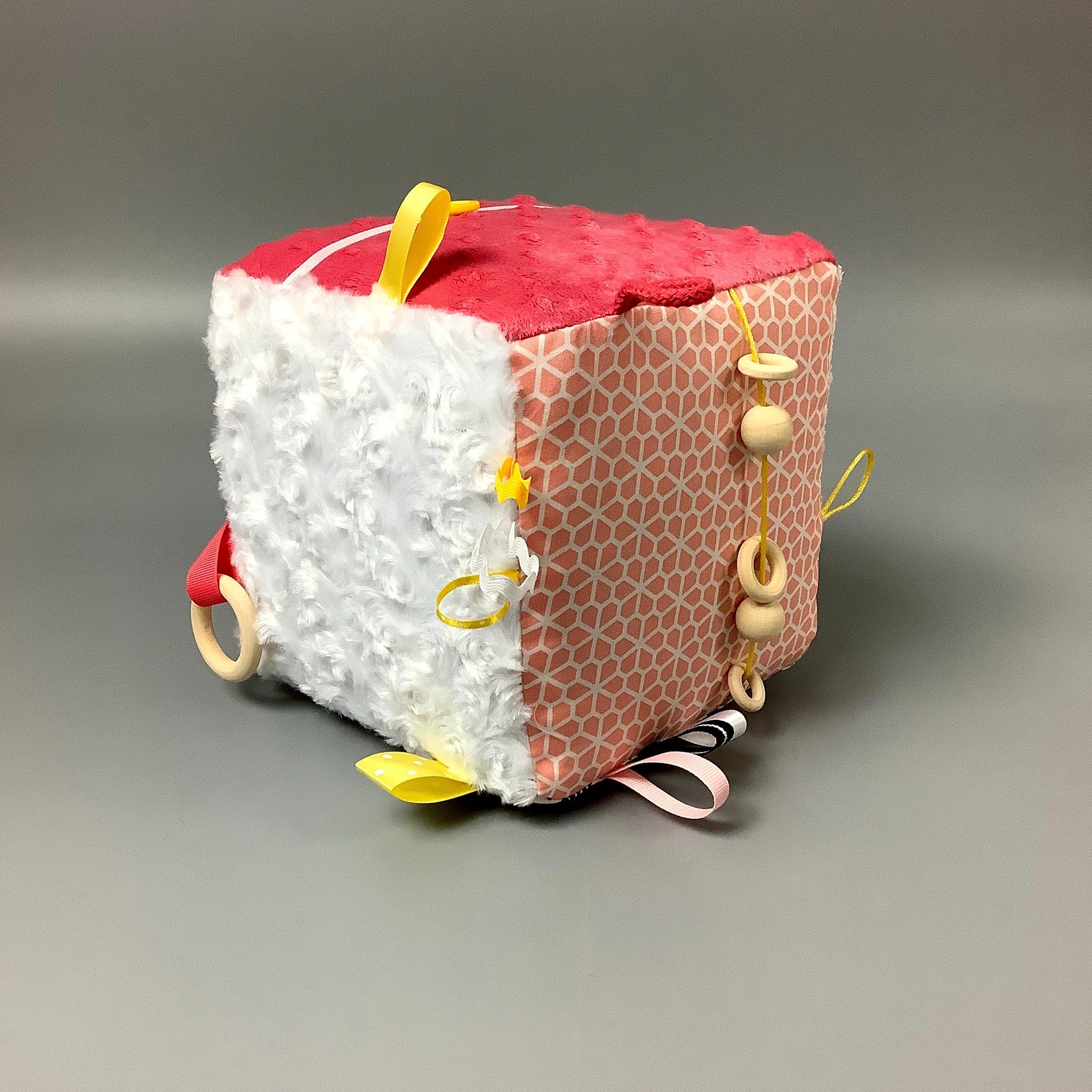 Fait en coton avec rubans et petits accessoires de bois. Le cube fait du bruit lorsqu’il est agité.