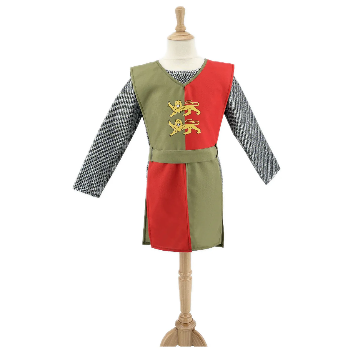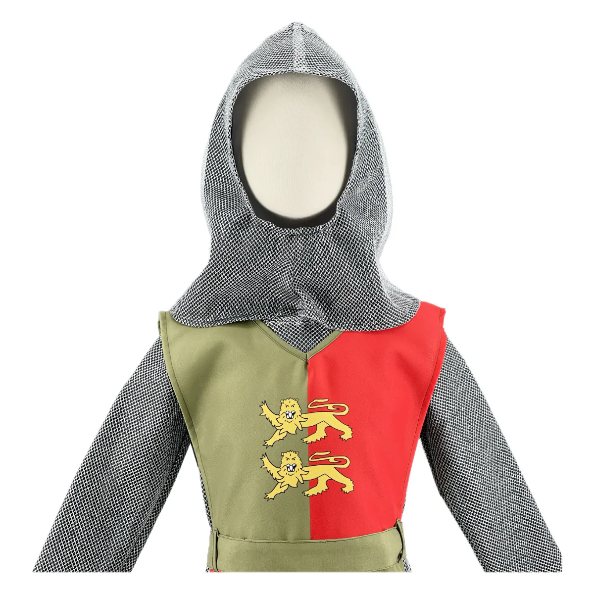 Ce déguisement comprend une veste imitation cote de maille avec cagoule intégrée pour un effet réaliste et héroïque, ainsi qu’une tunique bicolore ornée des léopards de Normandie, symbole de courage et de noblesse.