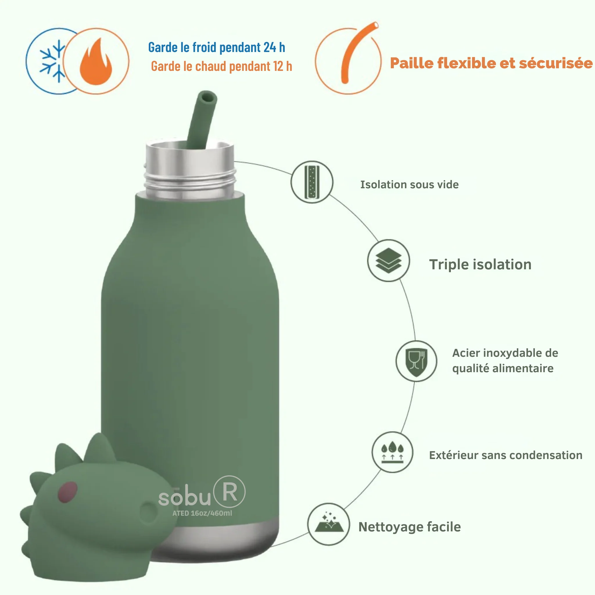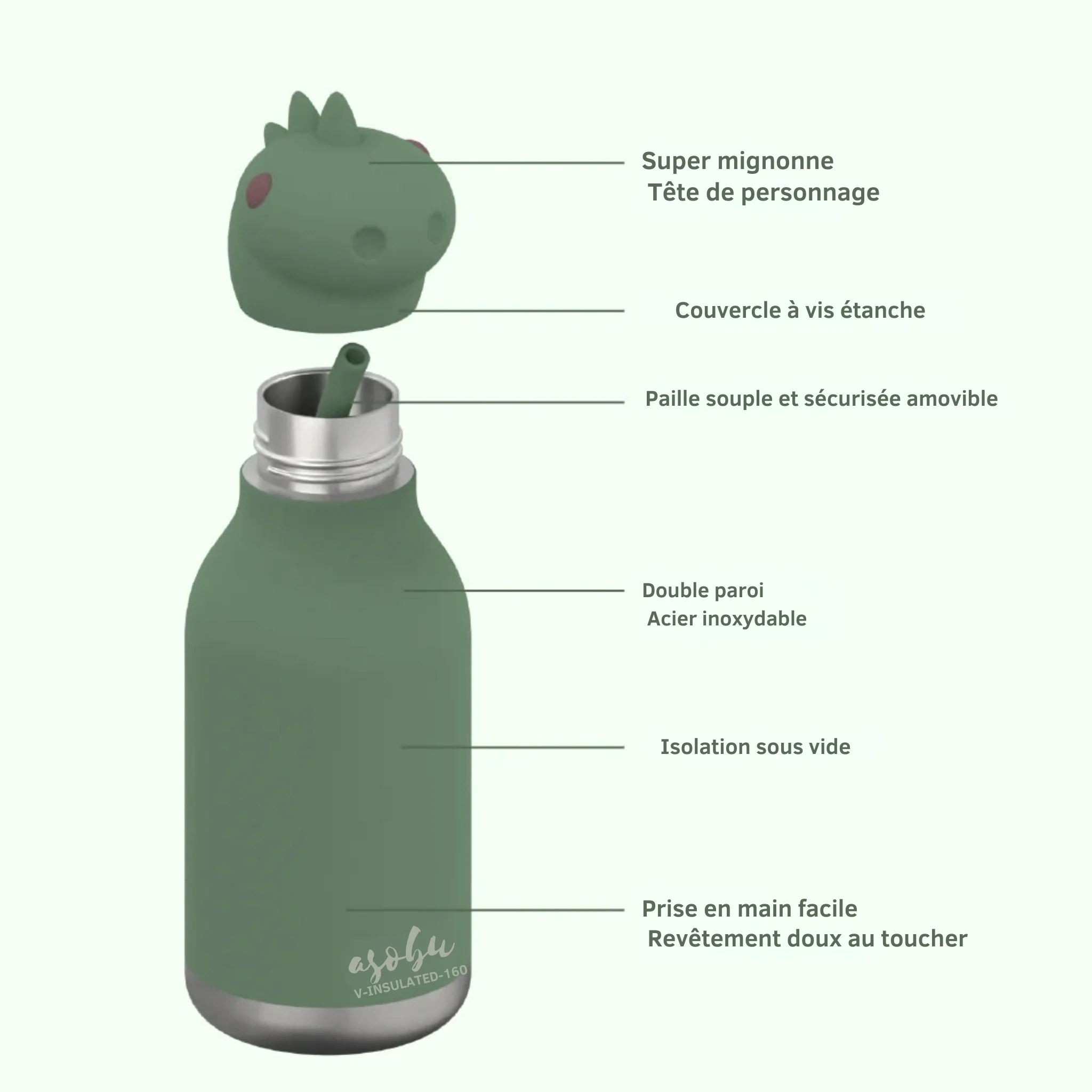 Ajoutez une touche de fantaisie à votre routine ! Cette adorable gourde isotherme est dotée d’un bouchon en silicone amovible en forme de personnage à collectionner, rendant l’hydratation amusante et ludique. Grâce à son isolation à double paroi sous vide, elle garde les boissons fraîches pendant 24 heures — l’alliée parfaite pour toutes vos aventures.