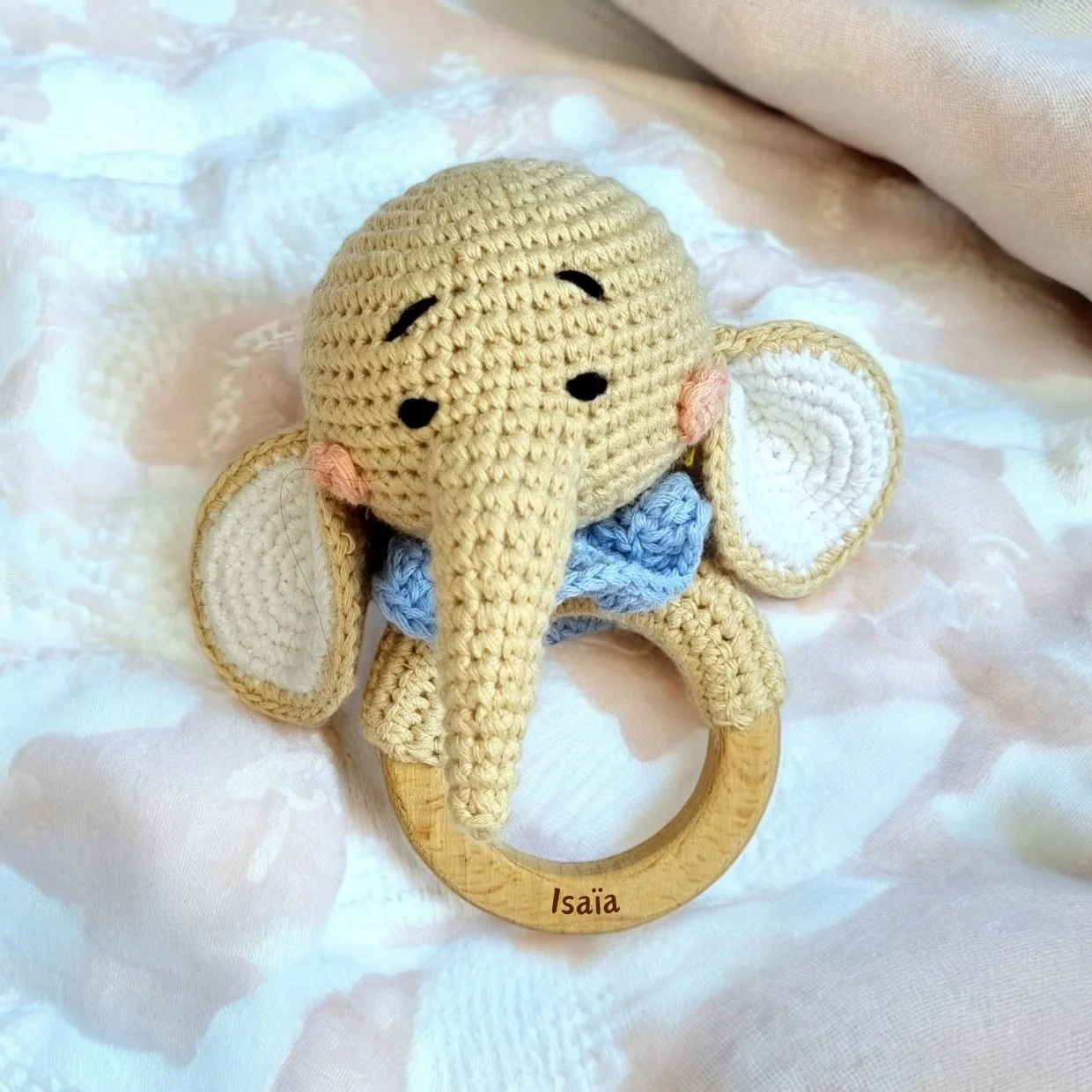 - Matériaux : Coton biologique pour le crochet, anneau en bois naturel, sans produits chimiques ni colorants toxiques.