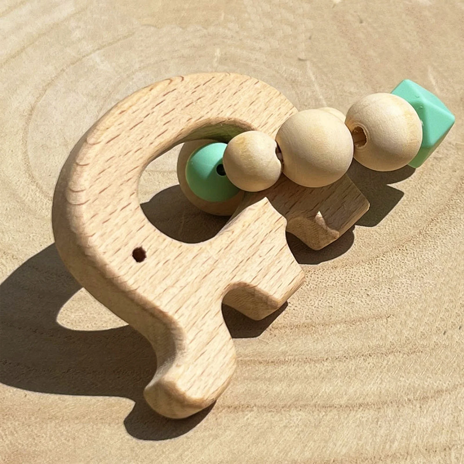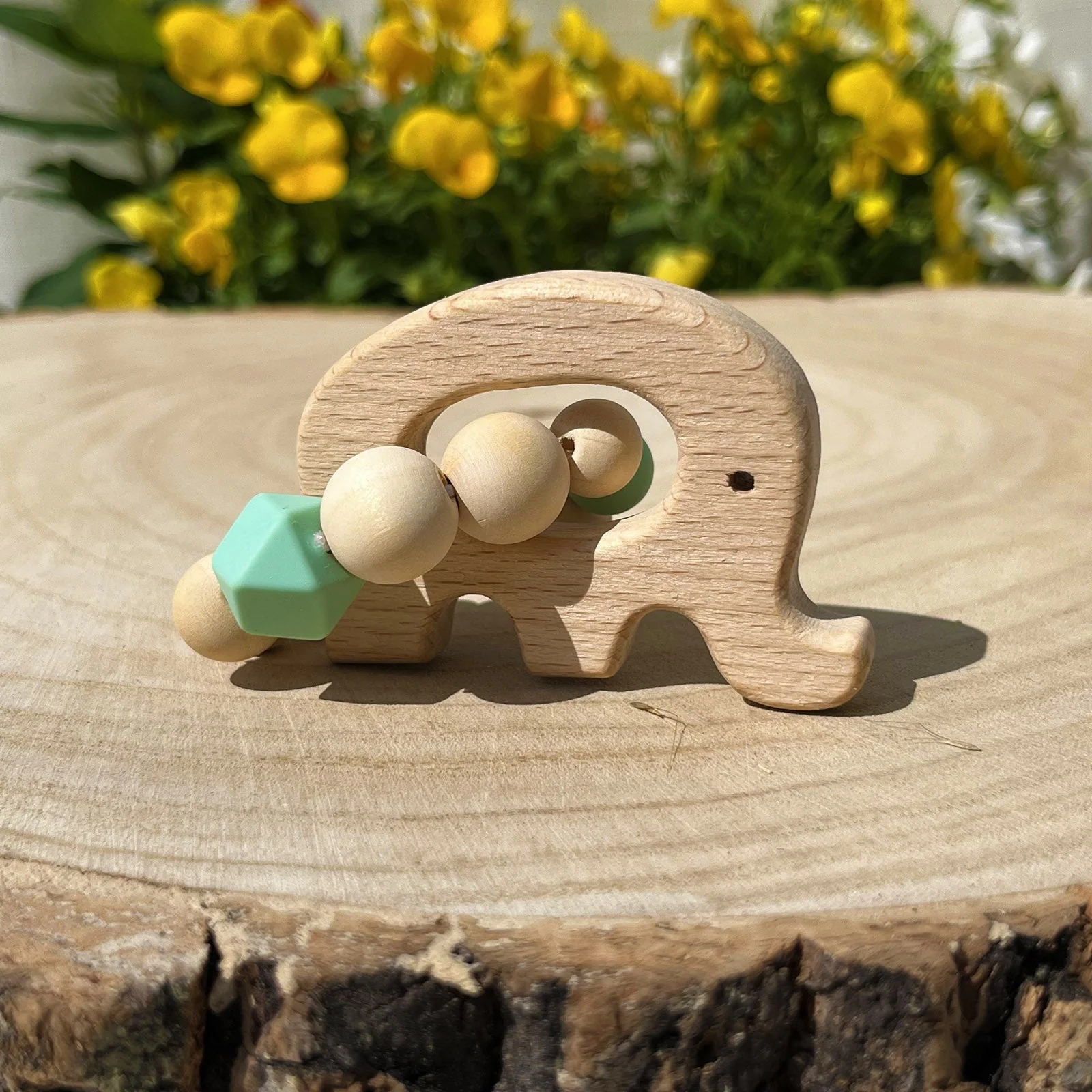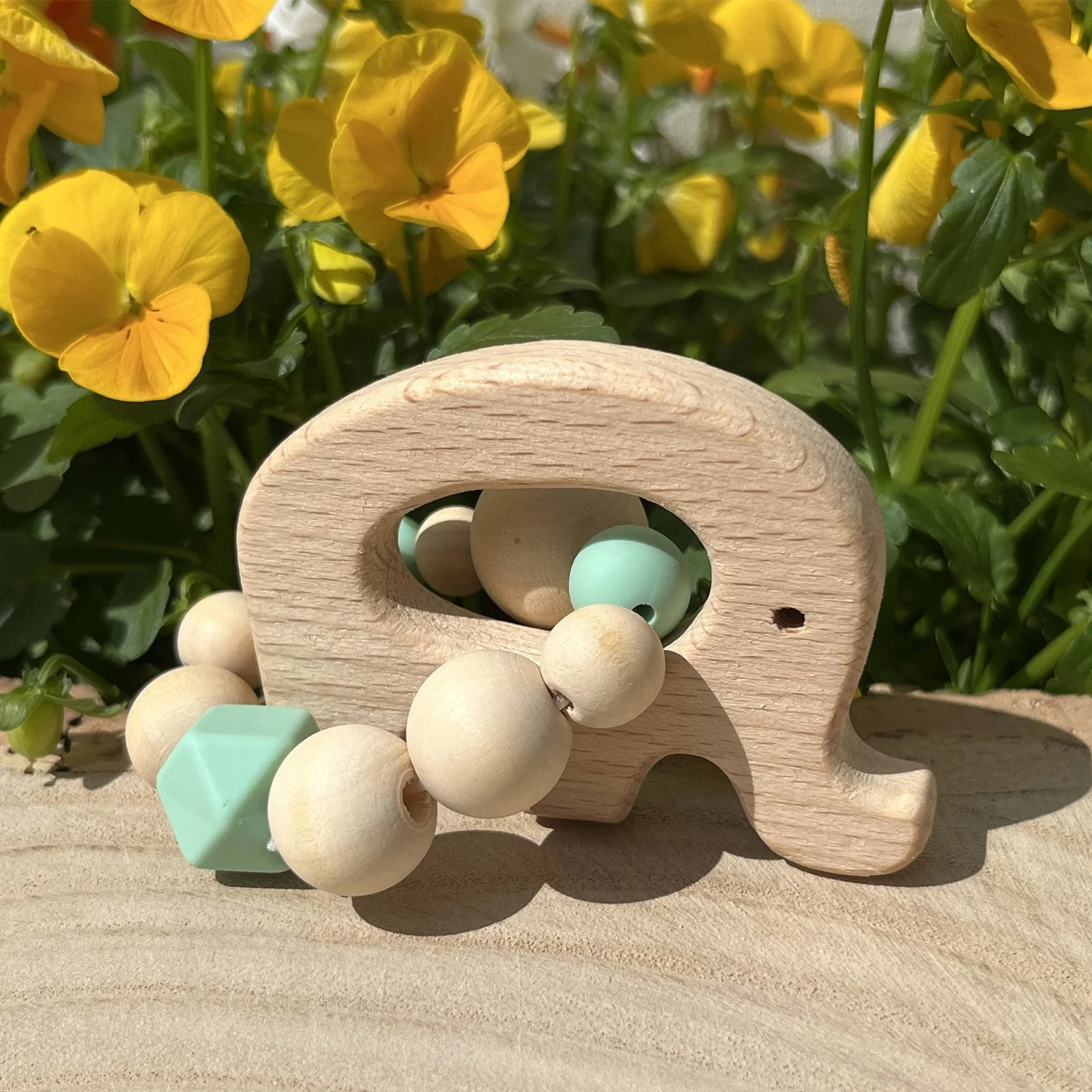 - En forme d’éléphant entouré de perles de bois et de silicone vert d’eau.
