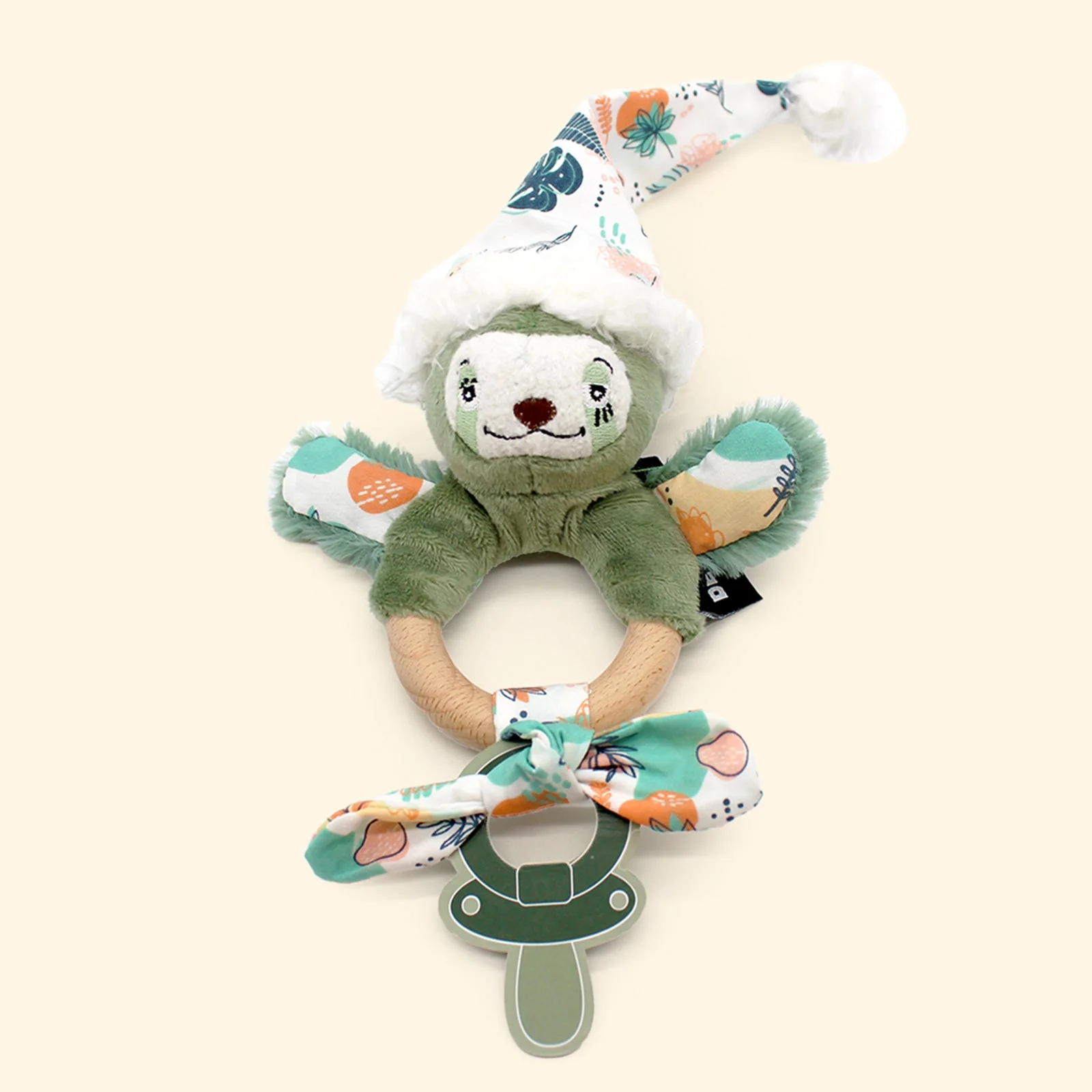 - L’anneau de dentition se compose d’un anneau en bois recouvert en partie par une peluche toute douce.