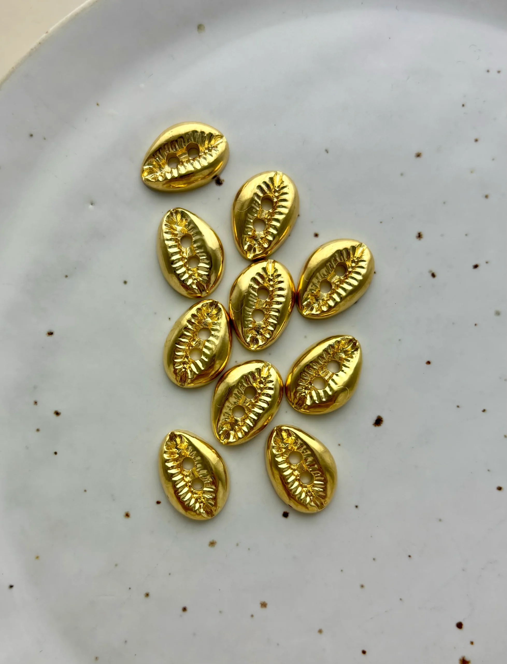 Lots de 10 boutons coquillage doré. Caractéristiques techniques : Matière : ABS (polymère métallisé) Taille : 22 mm Forme : Grain de café Aspect : Brillant Fixation : 2 trous Suivez notre actualité sur notre Instagram @com_1idee et partagez vos créations avec notre #com1idee !