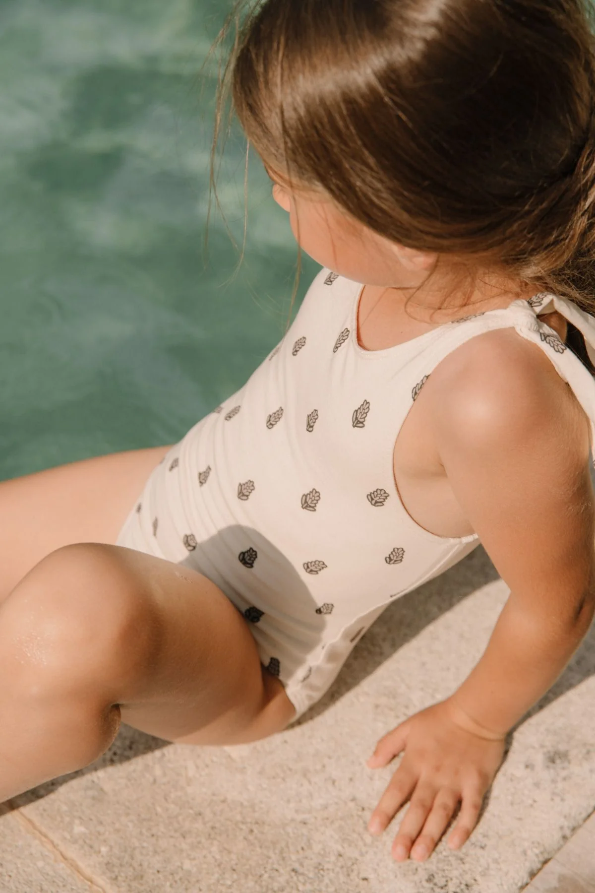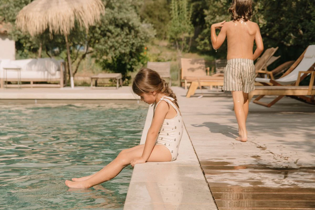 Maillot de bain 1 pièce en jersey de coton biologique. Encolure ronde. Bretelles ajustables à nouer sur les épaules.