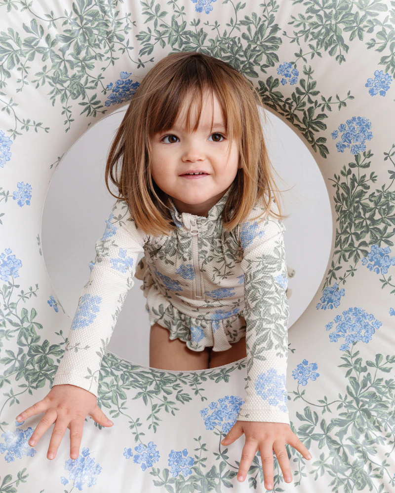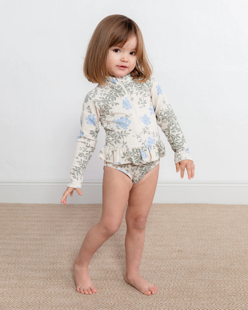 Maillot de bain à manches longues avec volants et fermeture éclair sur le devant pour un enfilage facile.