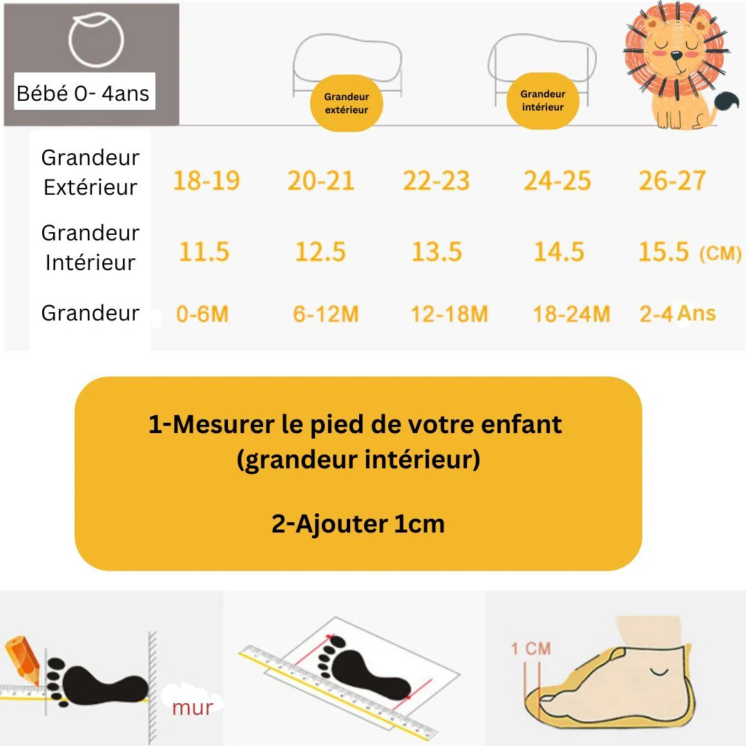 🦁 Veuillez mesurer la longueur intérieure réelle de votre enfant et vous référer à la longueur intérieure réelle des chaussures à acheter. (Ajouter un 1 cm)
