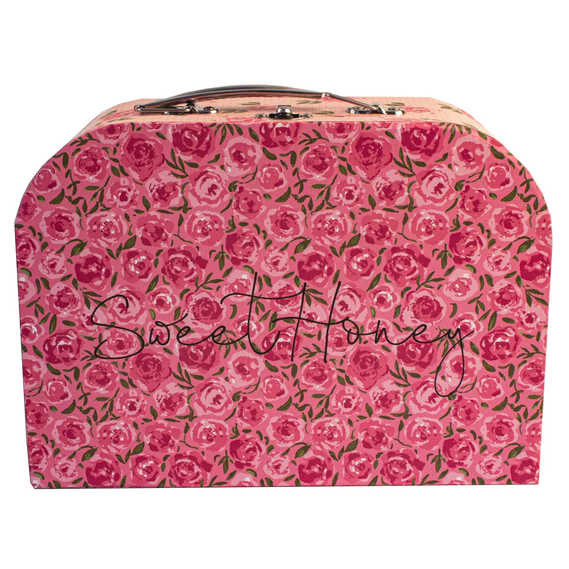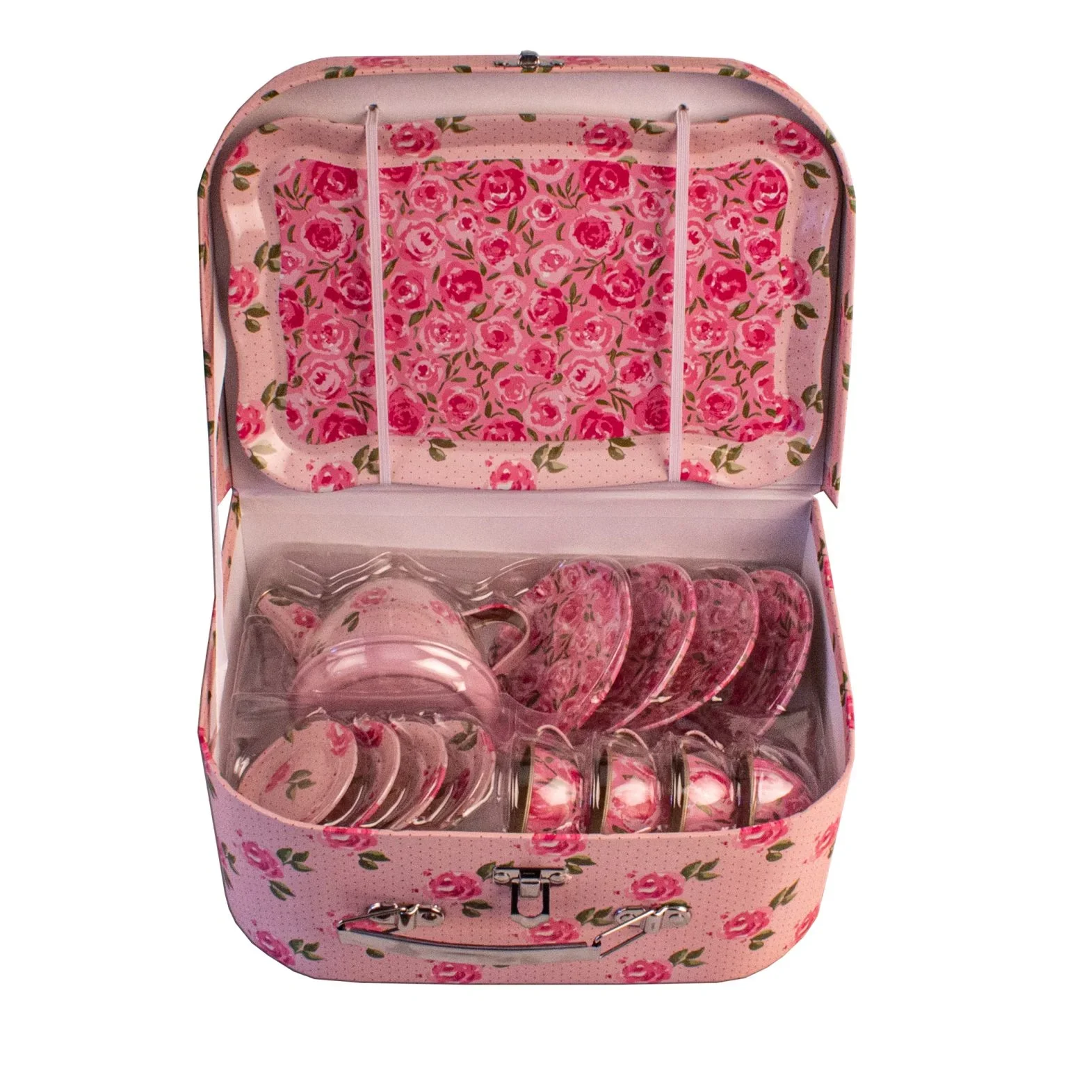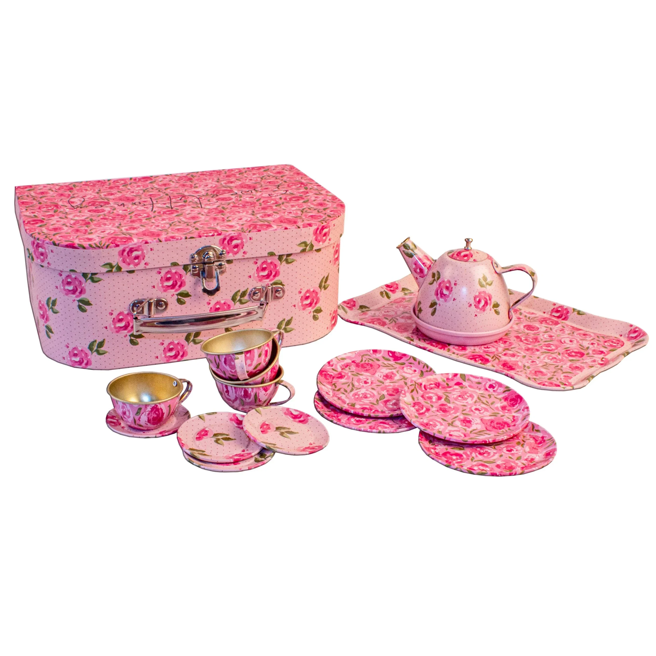 Service à thé en métal dans valisette – fleurs roses