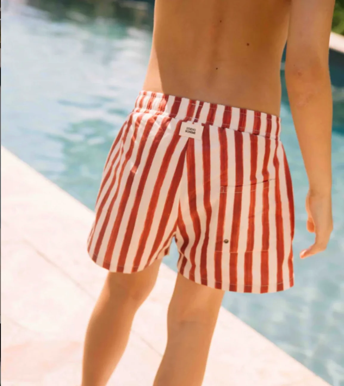 Short de bain imprimé en popeline de coton biologique. Poche à l’arrière.