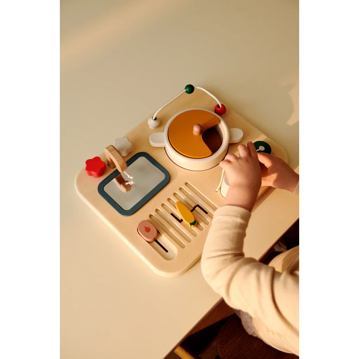 Le tableau d’activité en bois ludique MAGNUS invite les petits chefs à remuer, secouer et faire revenir leurs créations grâce à un jeu sensoriel stimulant. Fabriqué en bois de hêtre durable et en MDF, ce tableau d’activité sensorielle éveille la curiosité avec un couvercle de casserole tournant, des salières et poivrières qui cliquettent, et un évier miroir ludique, stimulant ainsi le développement des compétences motrices fines.